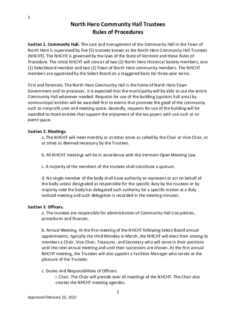 Get the free North Hero Community Hall Trustees Rules of Procedures