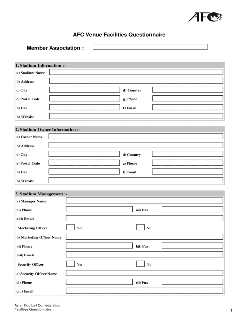 The AFC Venue Facilities Questionnaire Form serves as a crucial tool for evaluating and managing event venues effectively. Designed to gather comprehensive information about venue characteristics, this questionnaire aids in the meticulous planning and management of facilities by event organizers, venue owners, and stakeholders.