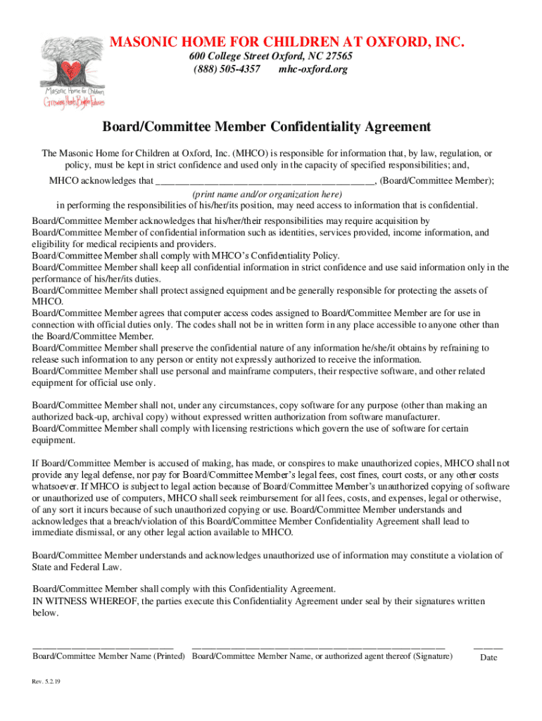 This document outlines the confidentiality obligations of Board/Committee Members at the Masonic Home for Children at Oxford, ensuring the protection of sensitive information and compliance with related