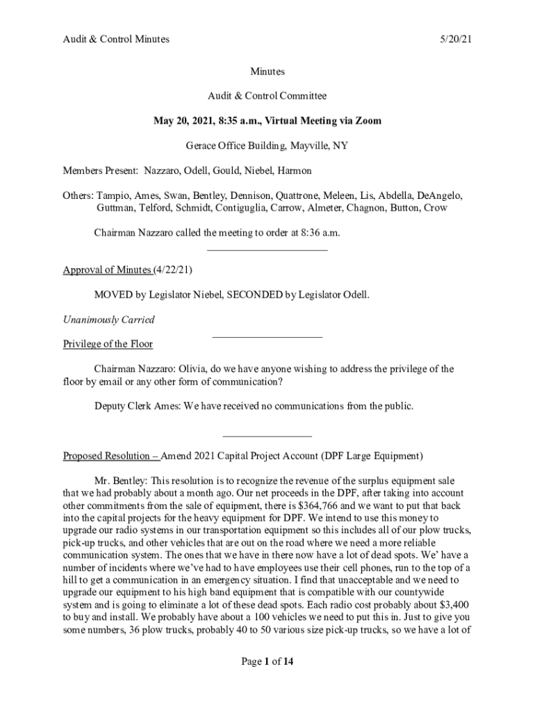 The document records the minutes of the Audit & Control Committee meeting held on May 20, 2021, detailing the members present, discussions on proposed resolutions, budget amendments, and other relevant