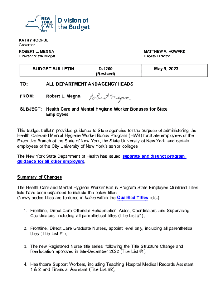 This budget bulletin provides guidance to State agencies regarding the administration of the Health Care and Mental Hygiene Worker Bonus Program for State employees of the Executive Branch, SUNY,