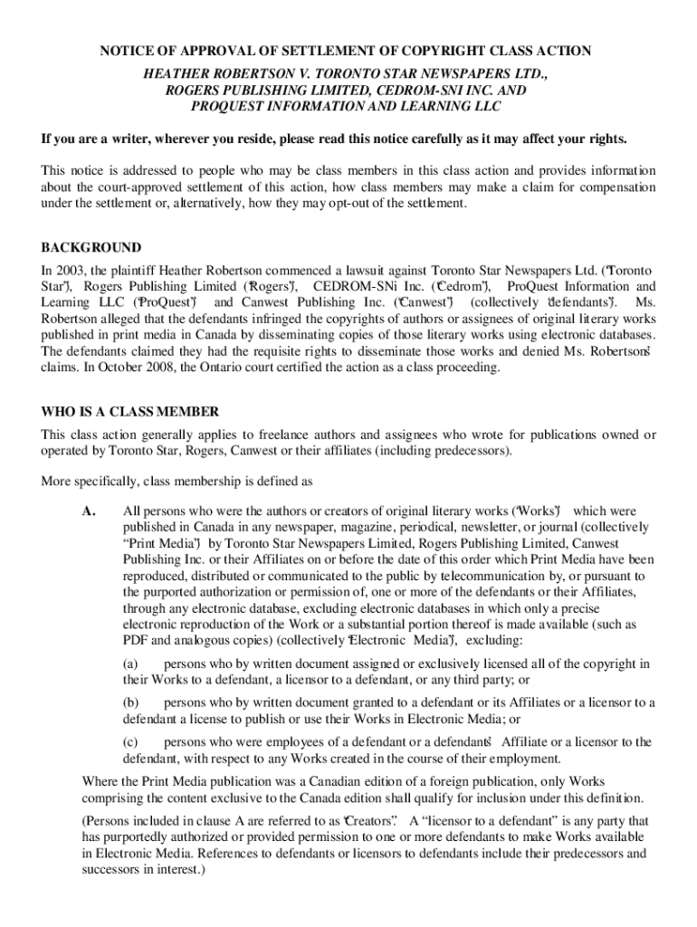 Get the free Notice of Approval of Settlement of Copyright Class Action