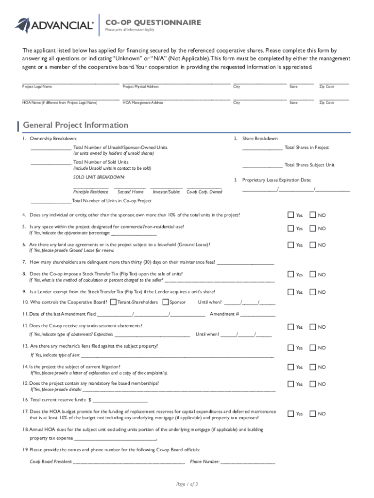 The importance of the co-op questionnaire cannot be overstated; it assesses the risk associated with granting a mortgage by detailing important information such as financial stability and compliance with local regulations. Understanding this document is crucial for potential buyers and lenders as it directly influences financing decisions.