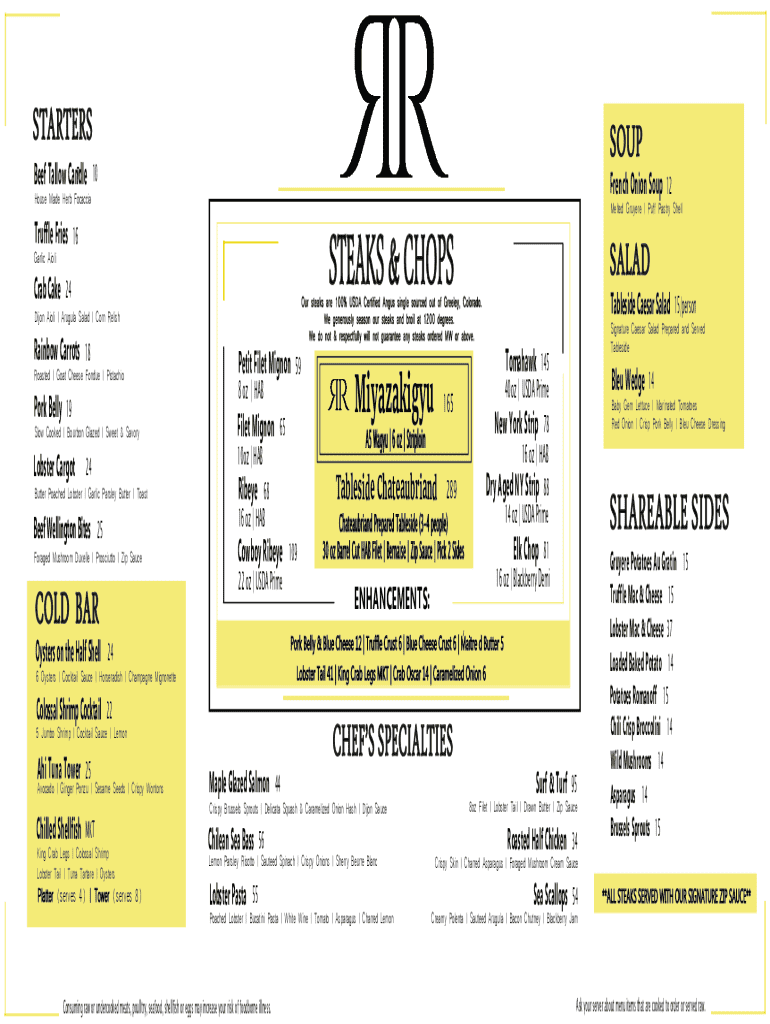 This document is a menu featuring various food items including starters, soups, steaks, chops, and chef\'s specialties along with prices.