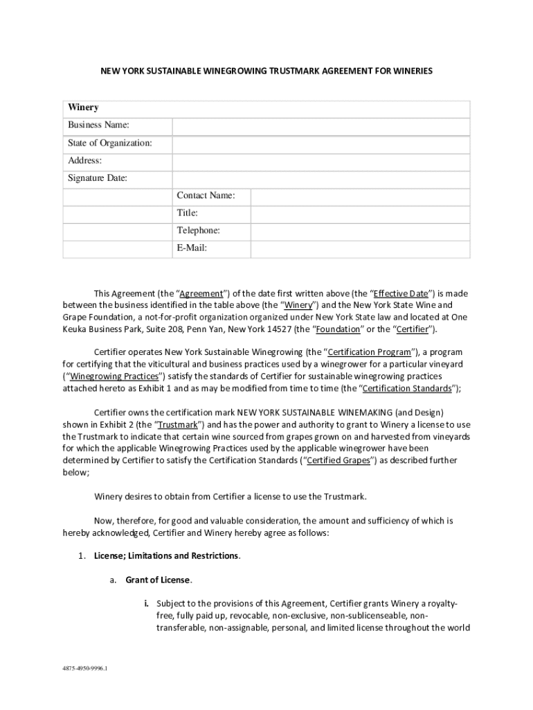 Get the free New York Sustainable Winegrowing Trustmark Agreement for Wineries