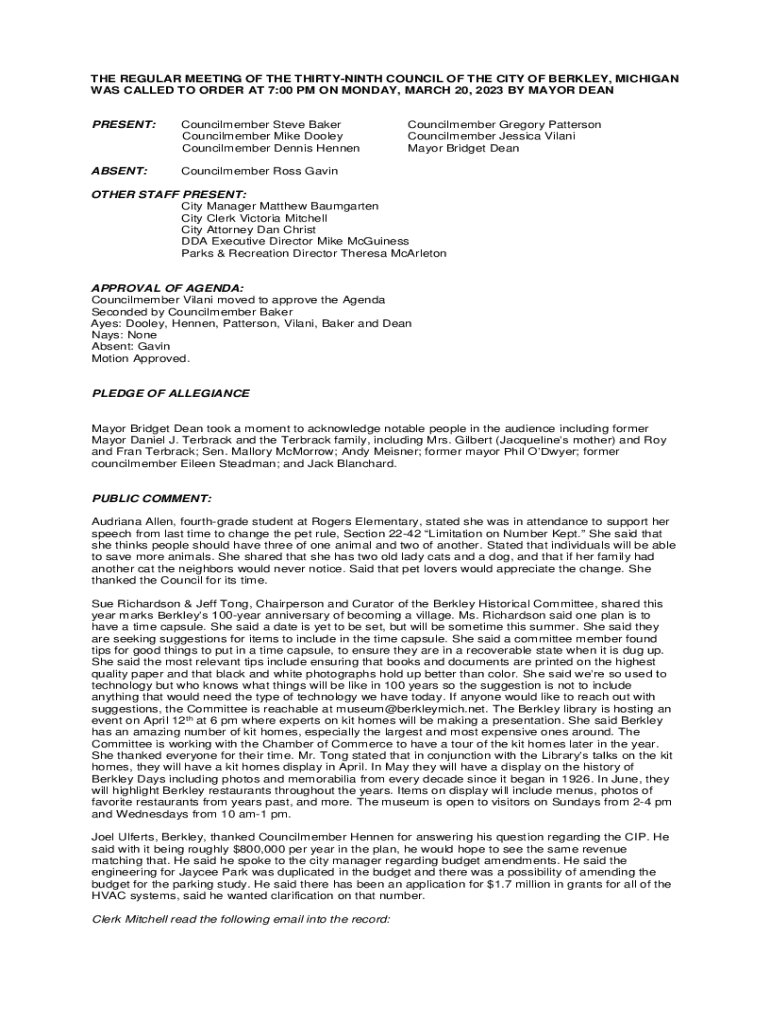 This document contains the minutes of the regular meeting of the city council, including attendance, agenda approvals, public comments, recognitions, resolutions, motions, and council communications.
