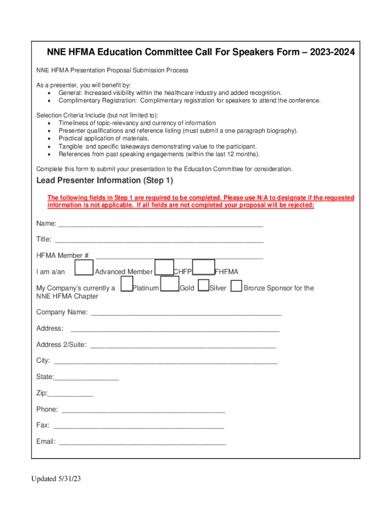 Get the free Nne Hfma Education Committee Call for Speakers Form – 2023-2024