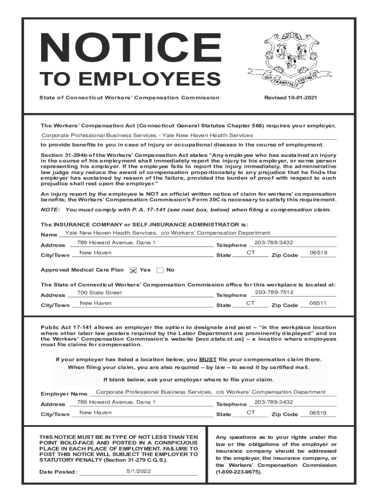 This document informs employees about their rights and obligations under the Connecticut Workers\' Compensation Act, including procedures for reporting injuries and filing claims.