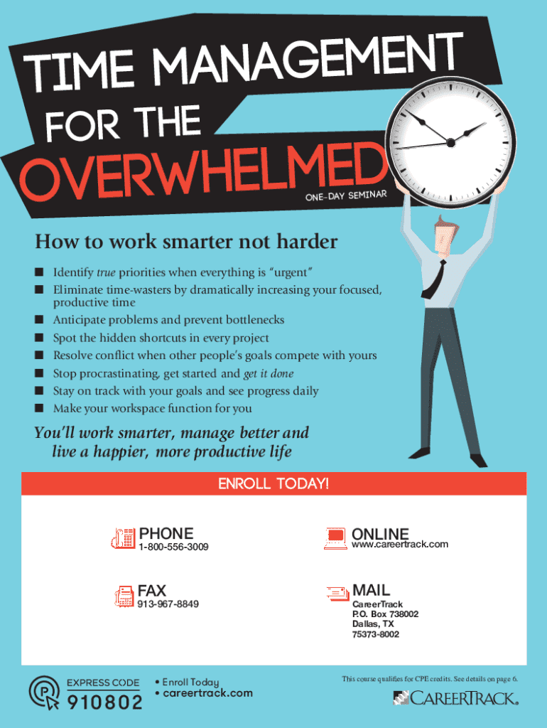 This document is a promotional material for a one-day seminar designed to help participants work smarter, eliminate time-wasters, and enhance productivity through effective time management strategies.