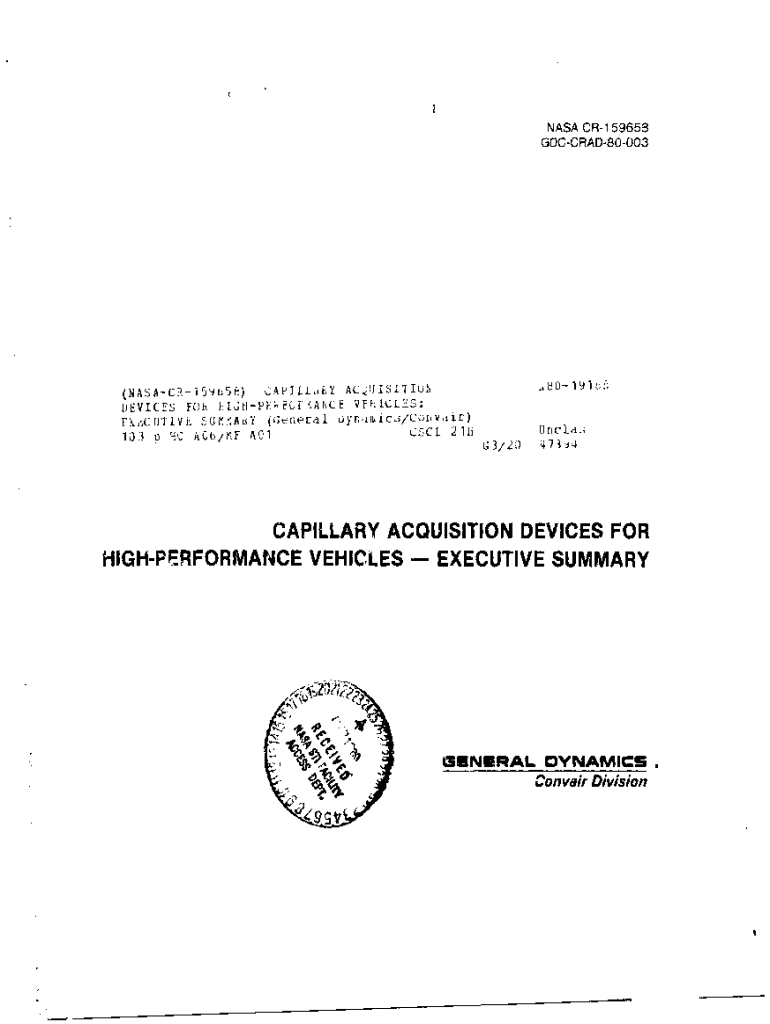 This document summarizes research and evaluation of capillary acquisition devices for high-performance vehicles, focusing on their technology, thermal conditioning, liquid refilling, and performance