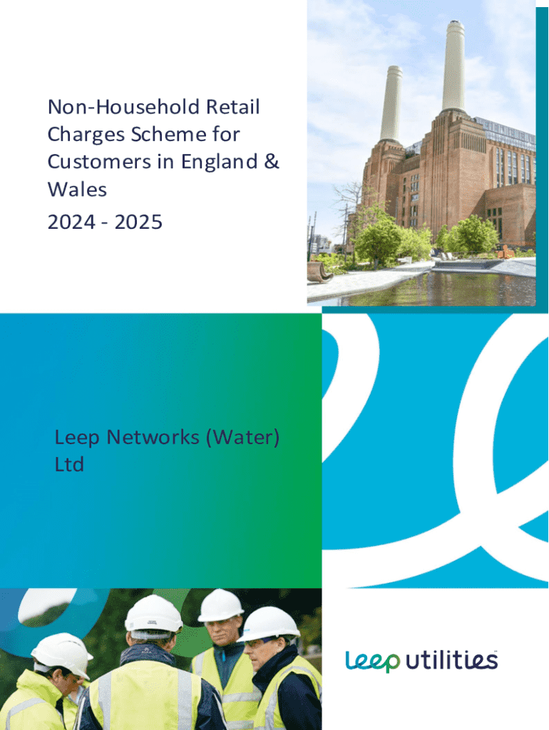This document outlines the Non-household Charges Scheme for 2024/25 for customers of Leep Networks (Water) Ltd, detailing applicable charges, regulations, and conditions for non-household water supply