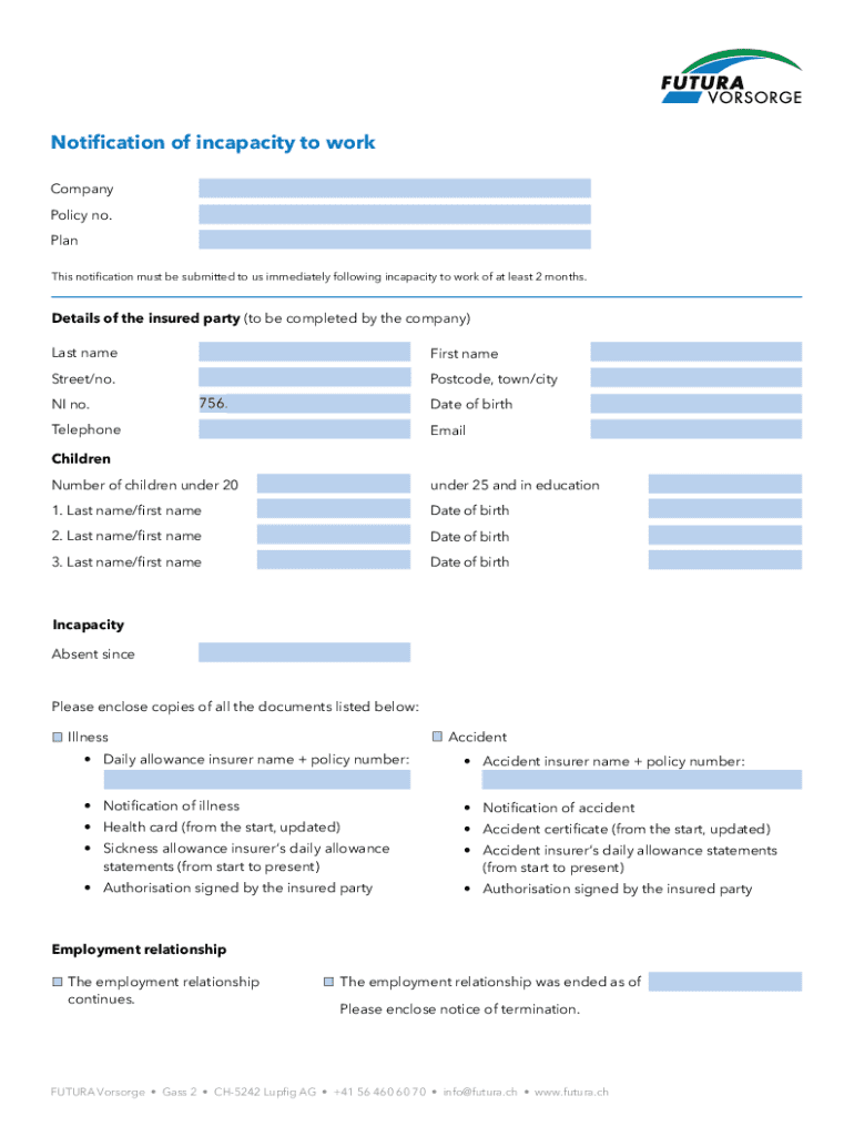 Get the free Notification of Incapacity to Work