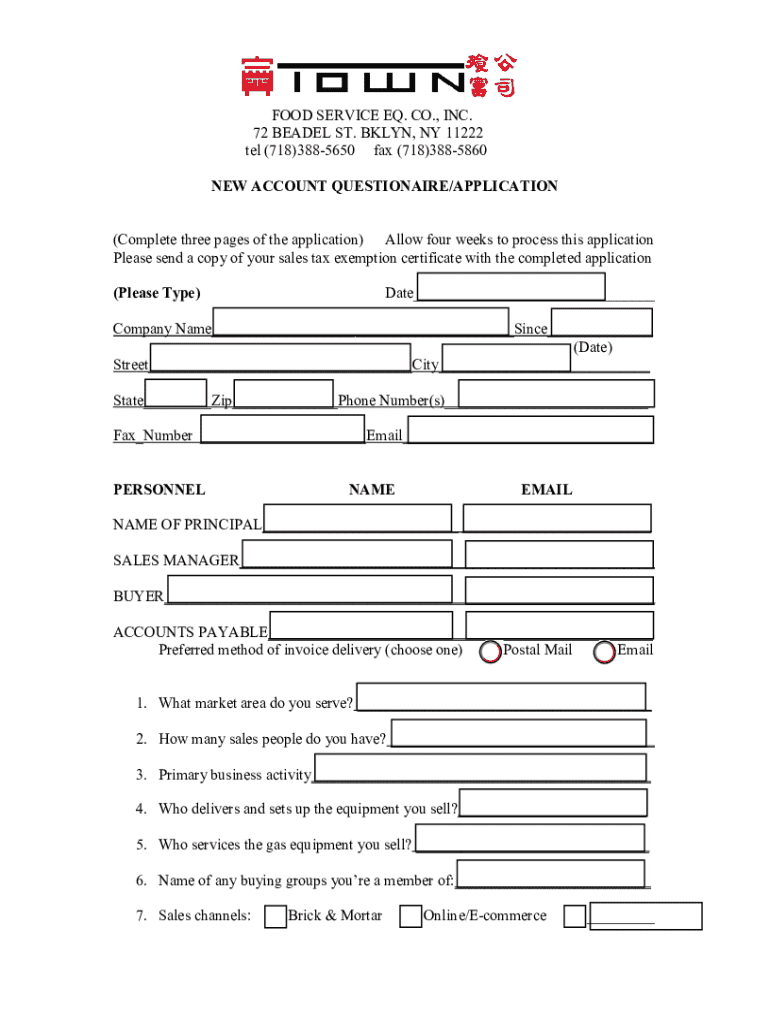 This document serves as a questionnaire and application for new accounts with Food Service Equipment Co., Inc., requiring information about the company, personnel, trade references, and banking details.