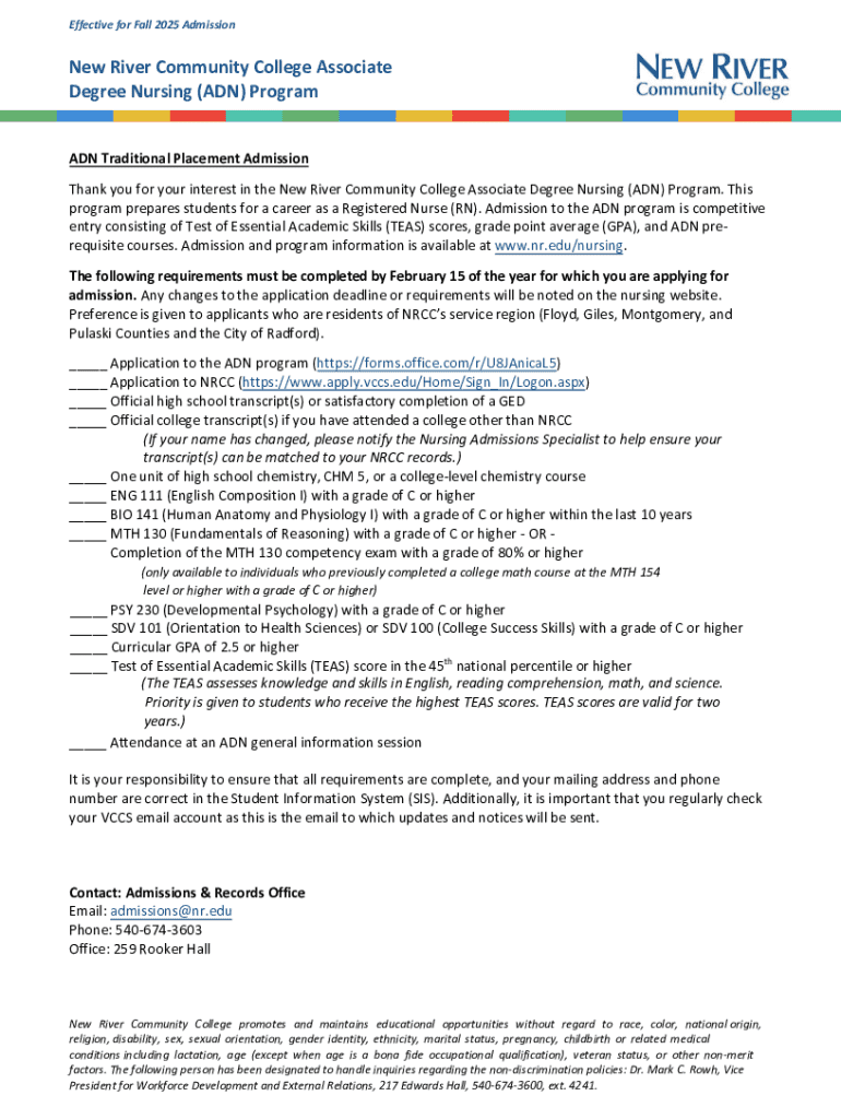 This document outlines the admission requirements and process for the Associate Degree Nursing (ADN) program at New River Community College, effective for Fall 2025. It includes academic prerequisites,