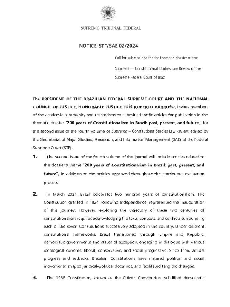 O documento convida a comunidade acadêmica e pesquisadores a submeter artigos científicos para publicação no dossiê temático \"200 anos de Constitucionalismo no Brasil: passado, presente e futuro\"