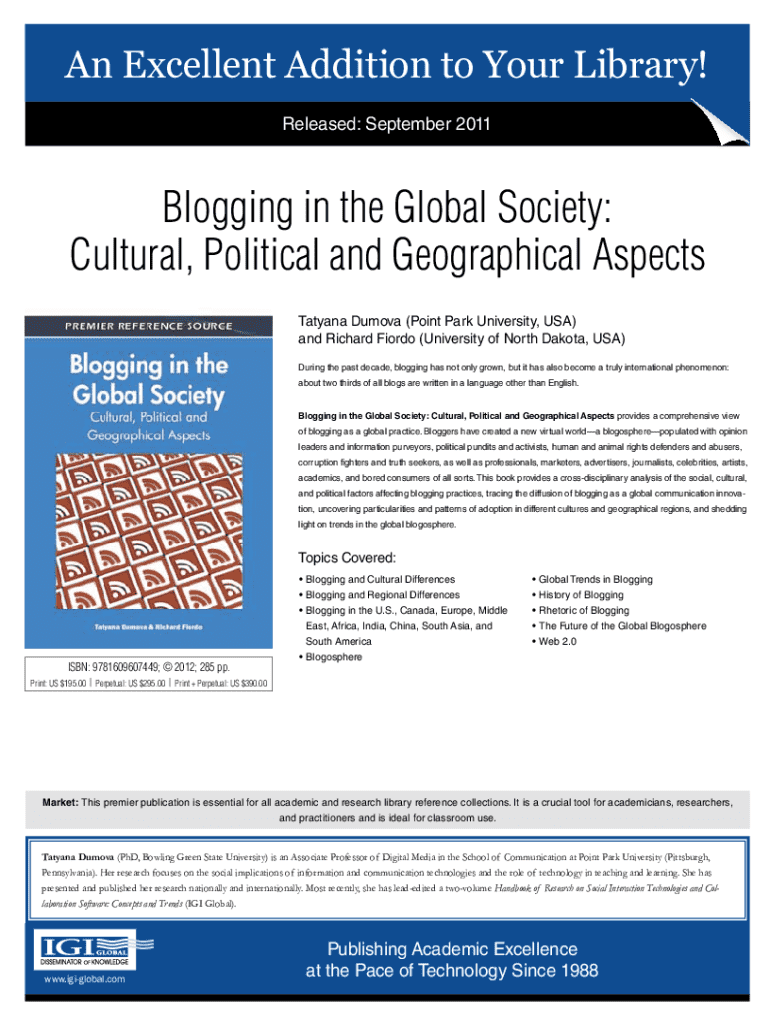 Get the free Blogging in the Global Society: Cultural, Political and Geographical Aspects