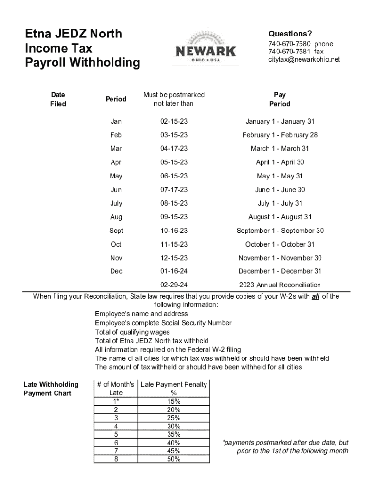 This document outlines the process and requirements for filing payroll withholding taxes for the Etna JEDZ North Income Tax, including due dates, tax rates, penalties, and instructions for reconciliation.
