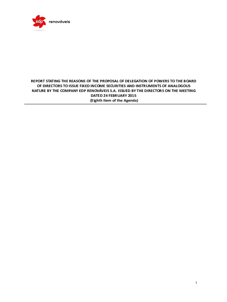 This report drafted by the Board of Directors of EDP Renováveis, S.A. outlines the reasons for a proposed resolution to delegate powers to the Board for issuing fixed-income securities and related