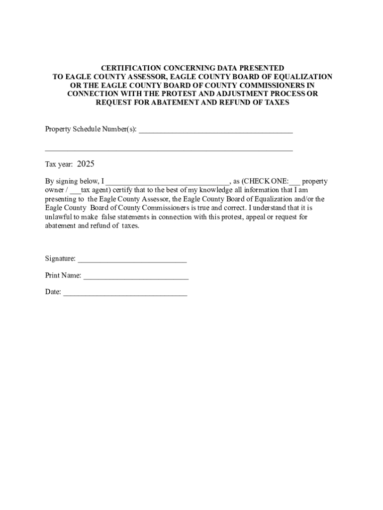 This document is a certification for property owners or tax agents to verify the truthfulness of information presented to the Eagle County Assessor and other relevant boards in relation to tax protests