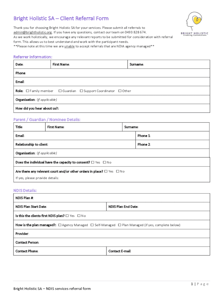 Get the free Bright Holistic Sa – Client Referral Form
