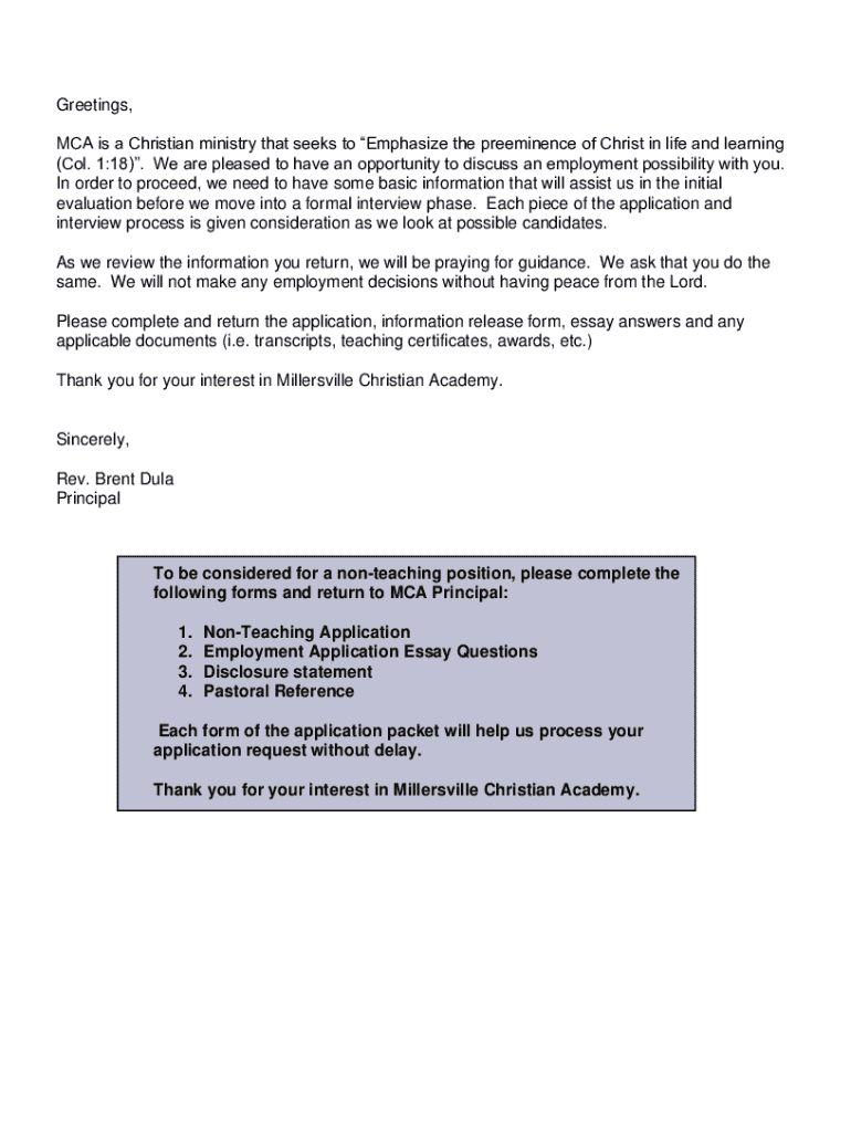 This document is an application form for individuals seeking non-teaching positions at Millersville Christian Academy. It includes sections for personal information, education, work experience, church