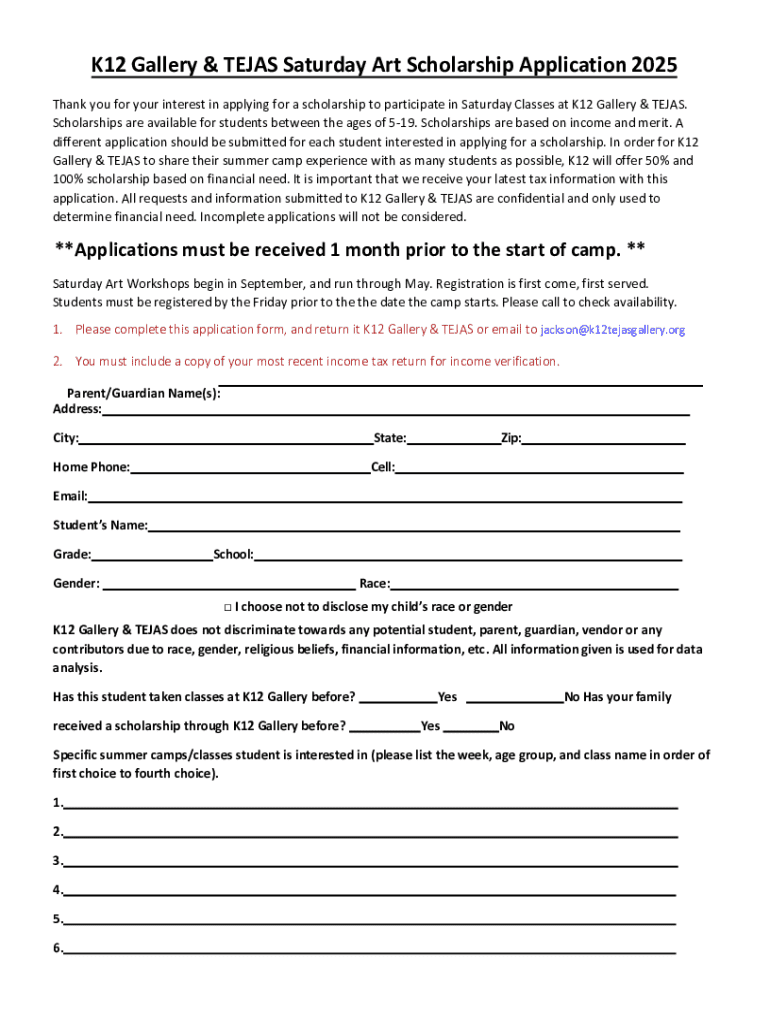 Application form for students aged 5-19 to apply for scholarships for Saturday Classes at K12 Gallery & TEJAS based on income and merit.