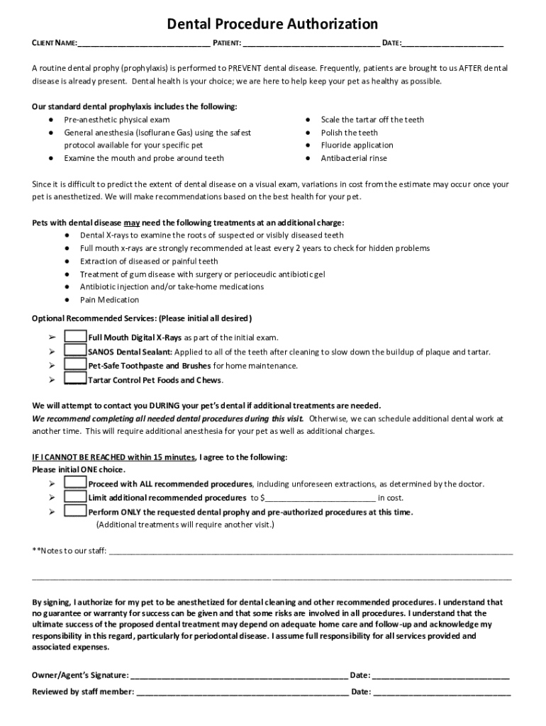 This document authorizes dental procedures for pets, detailing routine dental prophylaxis, potential additional treatments, and the responsibilities of the owner.