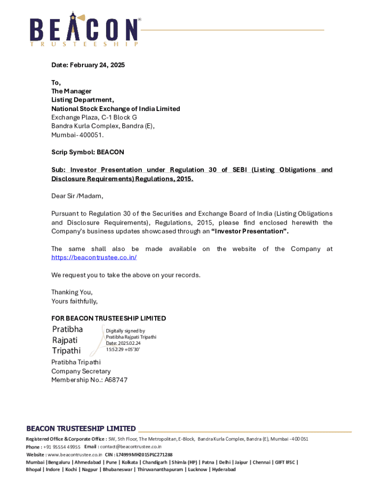 This document contains the investor presentation showcasing the business updates of Beacon Trusteeship Limited as of February 20, 2025, including financial highlights and future business prospects.