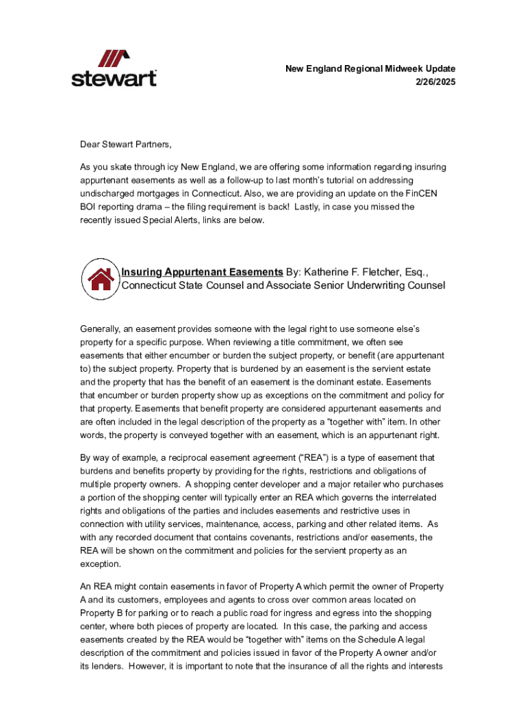 Este documento proporciona información sobre el aseguramiento de servidumbres accesorias, un seguimiento de una actualización previa sobre hipotecas no canceladas en Connecticut, y una actualización