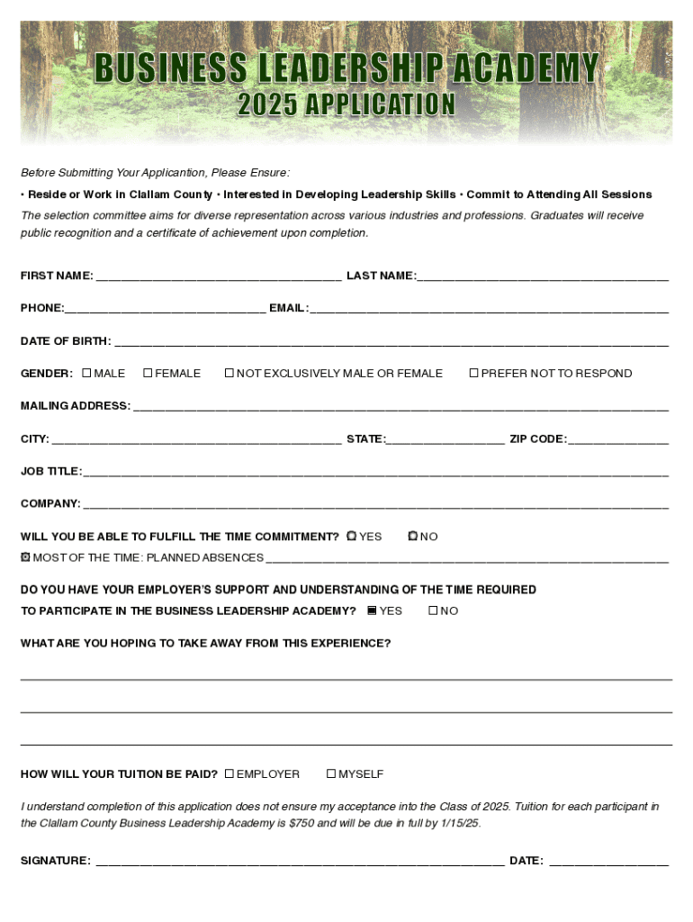 The Business Leadership Academy 2025 Form is pivotal in shaping future leaders by streamlining the application and enrollment process for prospective participants. This form is designed to gather essential information that aids in evaluating participants' qualifications and aligning them with the academy's leadership development objectives. As organizations increasingly recognize the value of effective leadership, this form plays a crucial role in ensuring that the academy can nurture and develop talent that meets the demands of contemporary business environments.