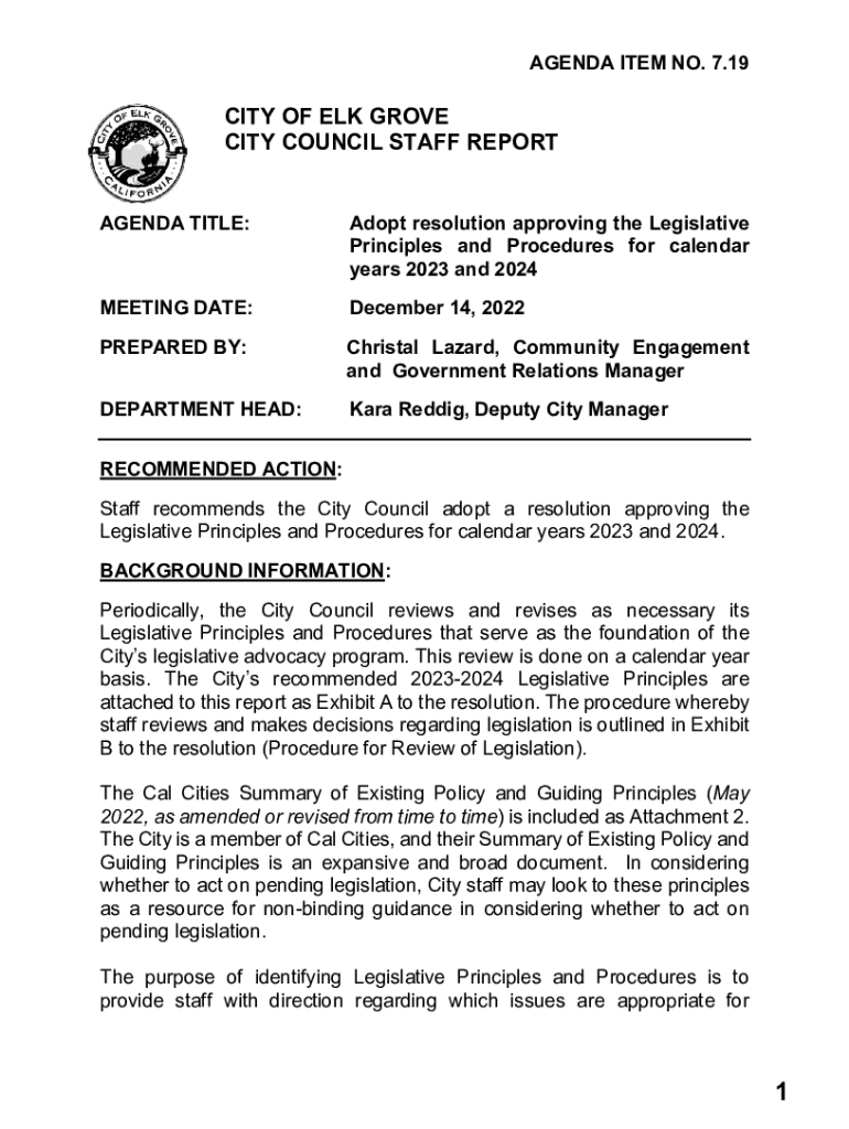 AGENDA ITEM NO. 7.19CITY OF ELK GROVE CITY COUNCIL STAFF REPORT AGENDA TITLE:Adopt resolution approving the Legislative Principles and Procedures for calendar years 2023 and 2024MEETING DATE:December