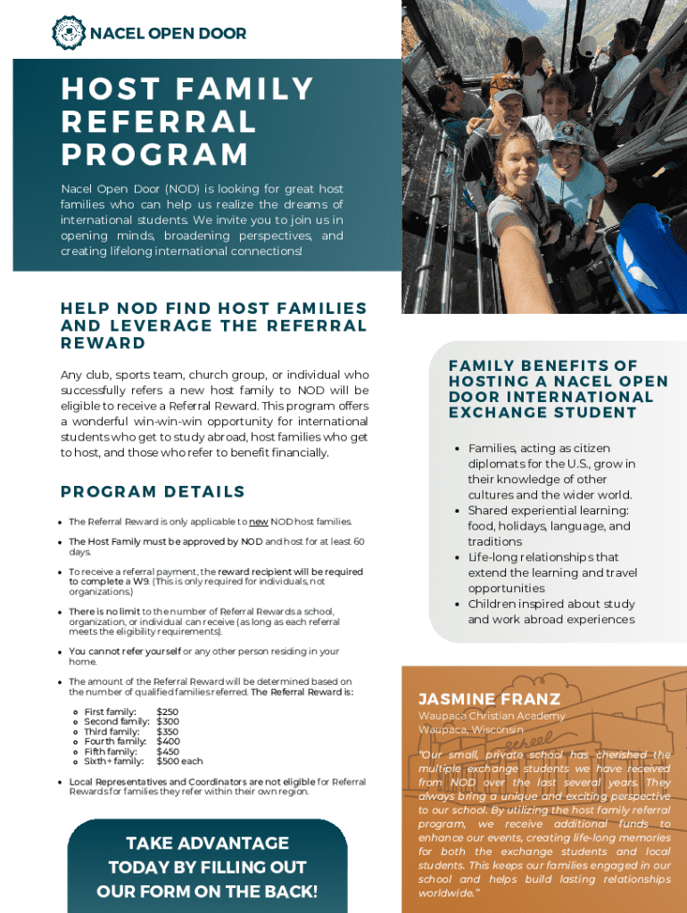 If you're ready to begin your exciting journey as a host family, fill out the NACEL Open Door Host Form today. The journey doesn’t just end once you've submitted the form; it opens up a world of opportunities for cultural exchange, friendship, and learning. With opportunities for further engagement with NACEL, hosting can be a rewarding experience that enriches your family’s lives as well as that of your international guest.