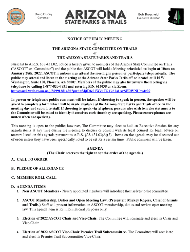 This document serves as a notice for the public meeting scheduled by the Arizona State Committee on Trails, outlining details such as the date, time, location, agenda items, and opportunities for