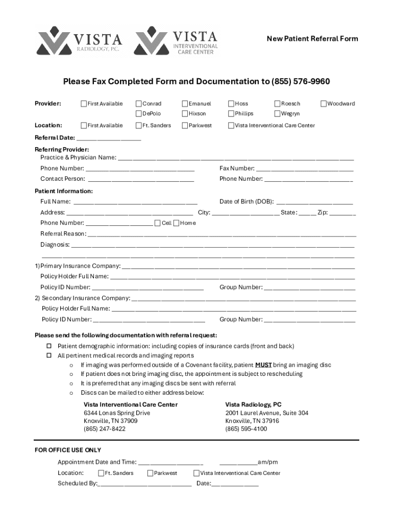 A form used to refer new patients to various providers or locations, including information on patient demographics and insurance details.