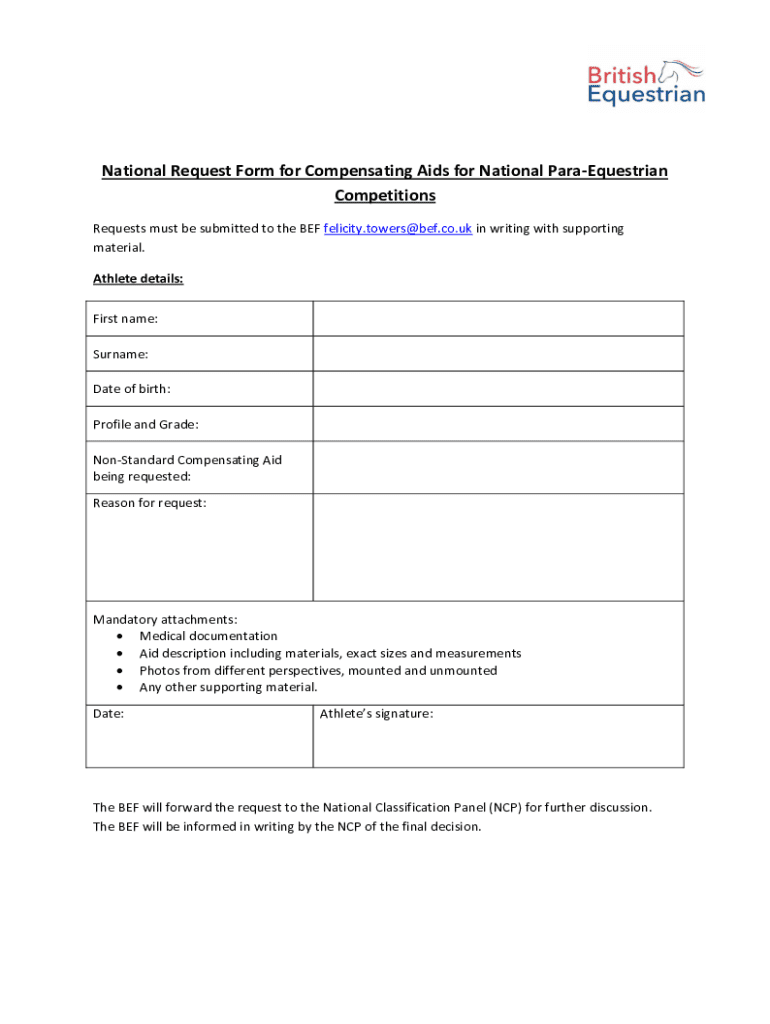 Get the free National Request Form for Compensating Aids for National Para-equestrian Competitions