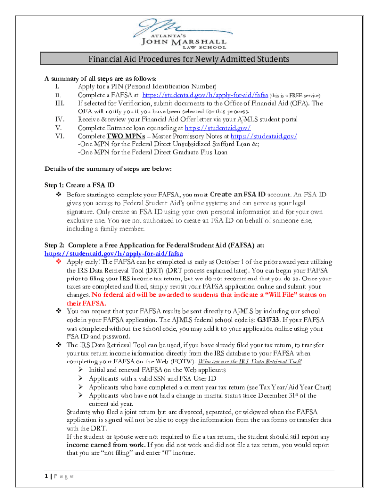 Get the free Financial Aid Procedures for Newly Admitted Students