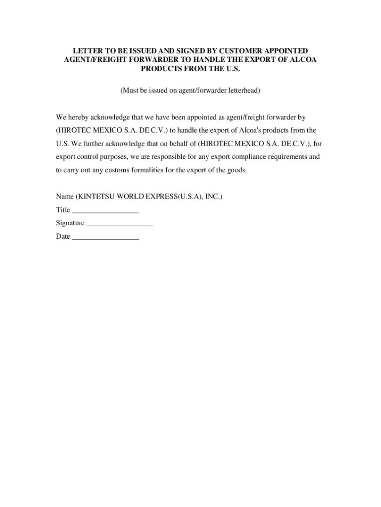 Get the free LETTER TO BE ISSUED AND SIGNED BY CUSTOMER APPOINTED AGENT/FREIGHT FORWARDER TO HAND...
