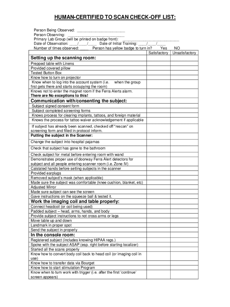 This document is a checklist for certifying individuals to perform scans, highlighting observations made during the training process and ensuring all safety and operational protocols are followed.