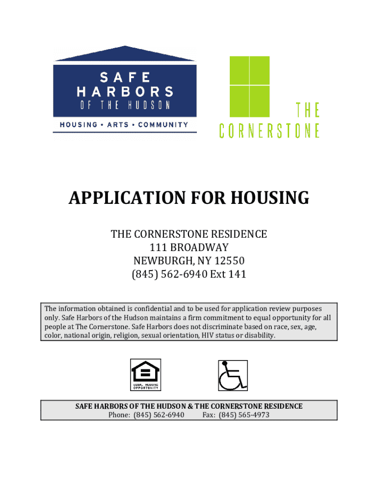This document is an application for housing at The Cornerstone Residence, a supportive housing facility in Newburgh, NY. It includes information on eligibility, income requirements, and the application