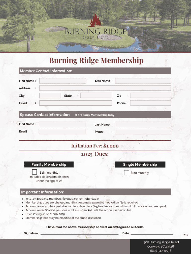 This document outlines the membership application process, fees, and terms for the Burning Ridge Golf Club, including member contact information, membership dues, benefits, and code of conduct.