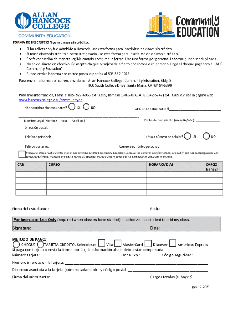 Formulario para inscribirse en clases sin crédito en el Allan Hancock College, incluyendo información personal, método de pago y firma del estudiante.