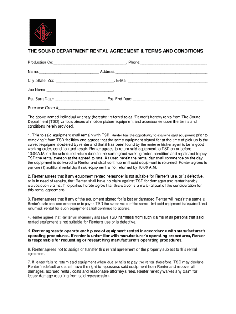 Get the free the Sound Department Rental Agreement & Terms and Conditions