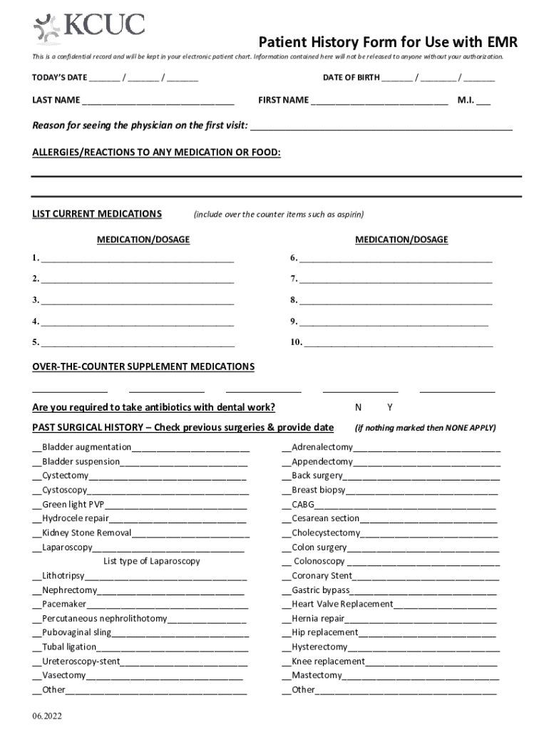 To fill out the patient history form, provide accurate and complete information regarding personal details, medical history, medications, allergies, family health history, and any current symptoms or concerns.