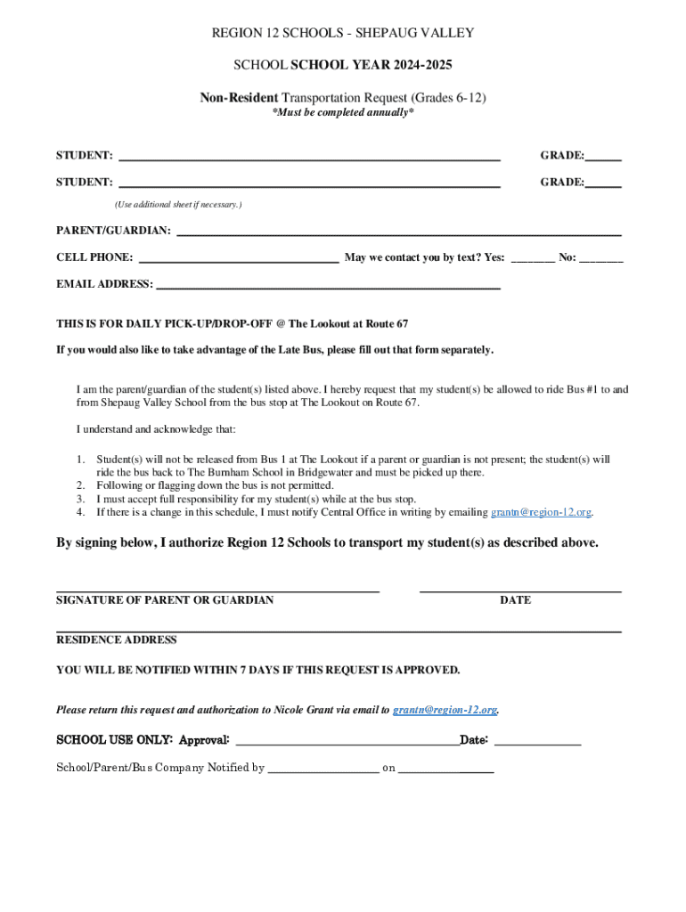The non-resident transportation request form serves a vital function for individuals and organizations seeking transport solutions for students who do not reside in the local district. This form is essential for ensuring safety and compliance with transportation policies, allowing non-residents the ability to access school or event transportation services efficiently.
