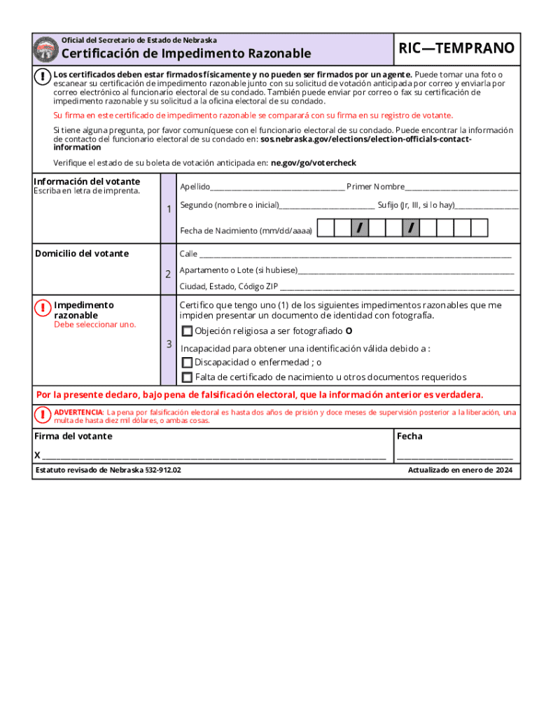 Este documento permite a los votantes en Nebraska certificar que tienen un impedimento razonable que les impide presentar una identificación con foto al solicitar votar por correo.