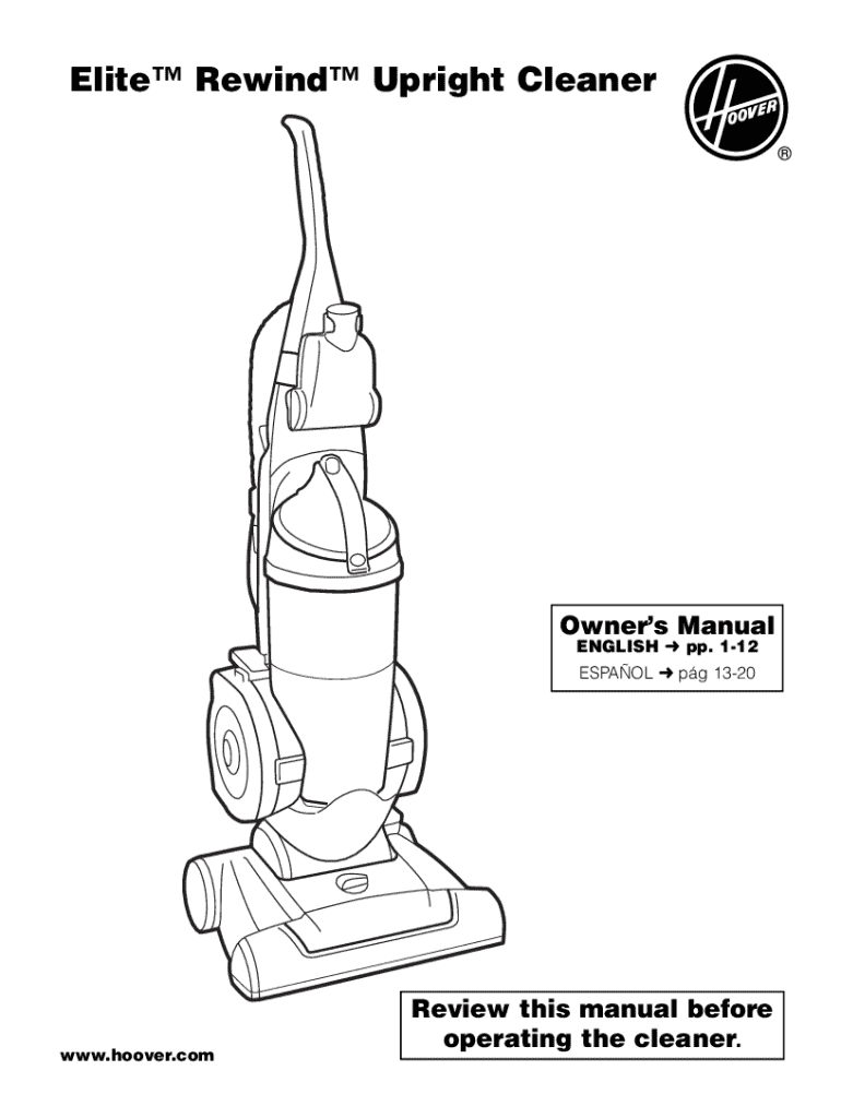 Este manual del propietario proporciona instrucciones esenciales para el uso, mantenimiento y servicio de la aspiradora vertical Elite™ Rewind™ de Hoover, incluyendo información sobre ensamblaje,