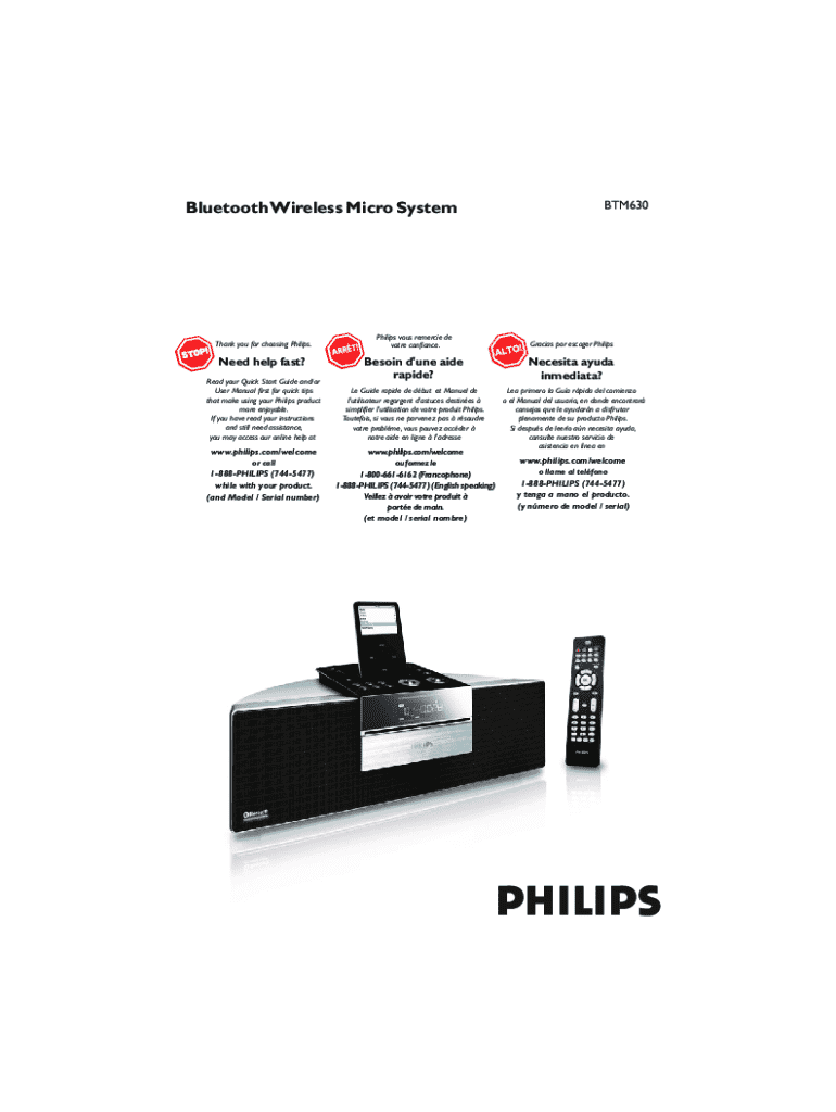 Le document fournit des instructions et des informations sur l\'utilisation du système audio sans fil BTM630 de Philips, y compris des détails sur la configuration, les fonctionnalités, et la sécurité.