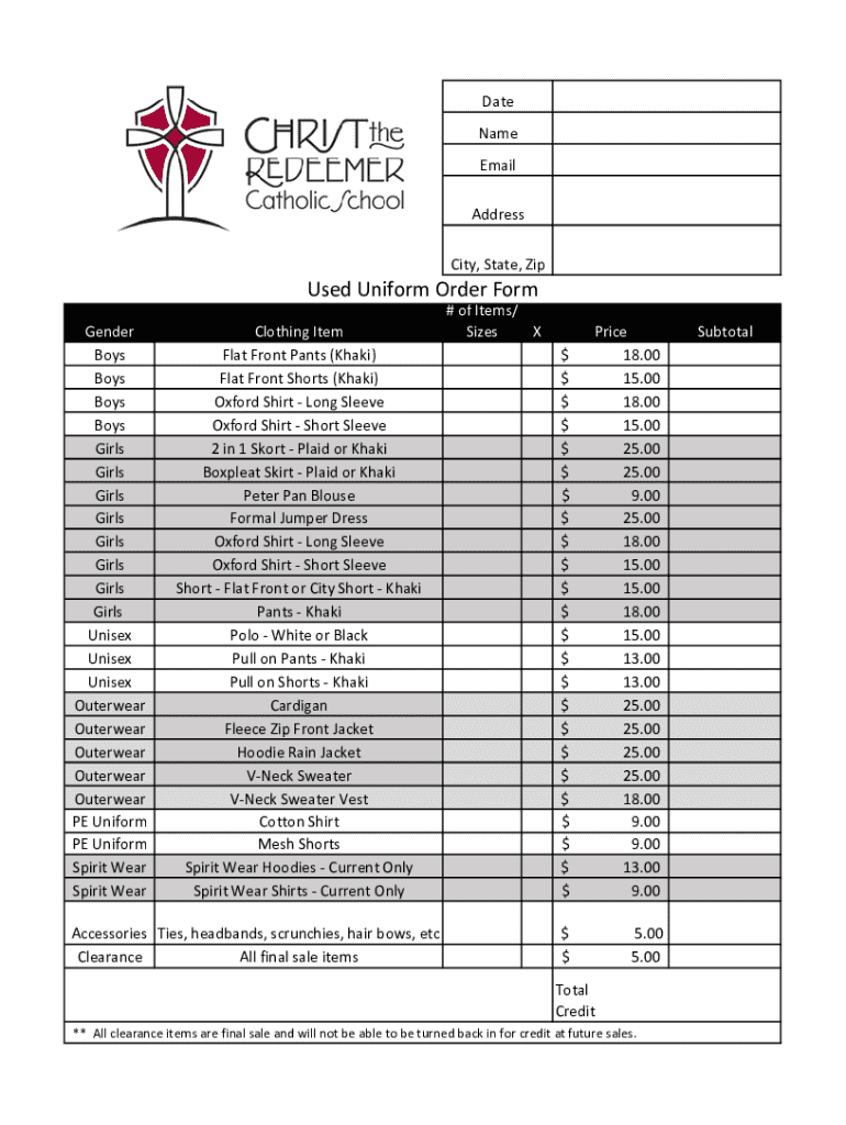 A used uniform order form is a document specifically designed to streamline the process of ordering second-hand school uniforms. Its primary purpose is to provide parents and guardians an efficient way to request affordable uniforms for their children. With the rising costs of educational materials and necessities, access to affordable school uniforms is a priority for many families.