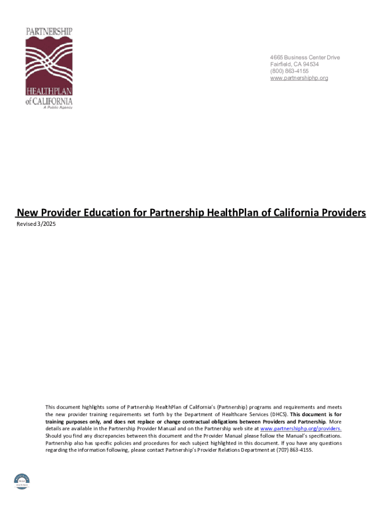 Get the free New Provider Education for Partnership Healthplan of California Providers