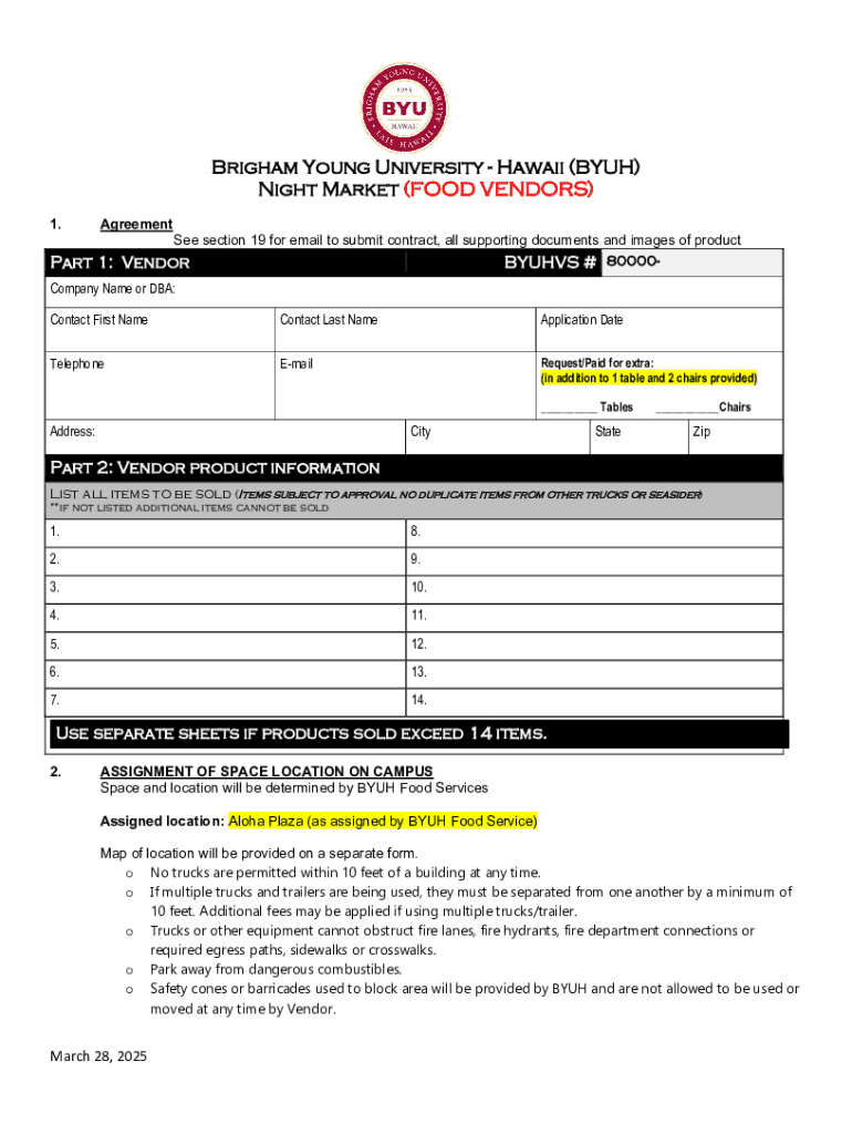 Get the free Brigham Young University - Hawaii Night Market Vendor Agreement - foodservices byuh